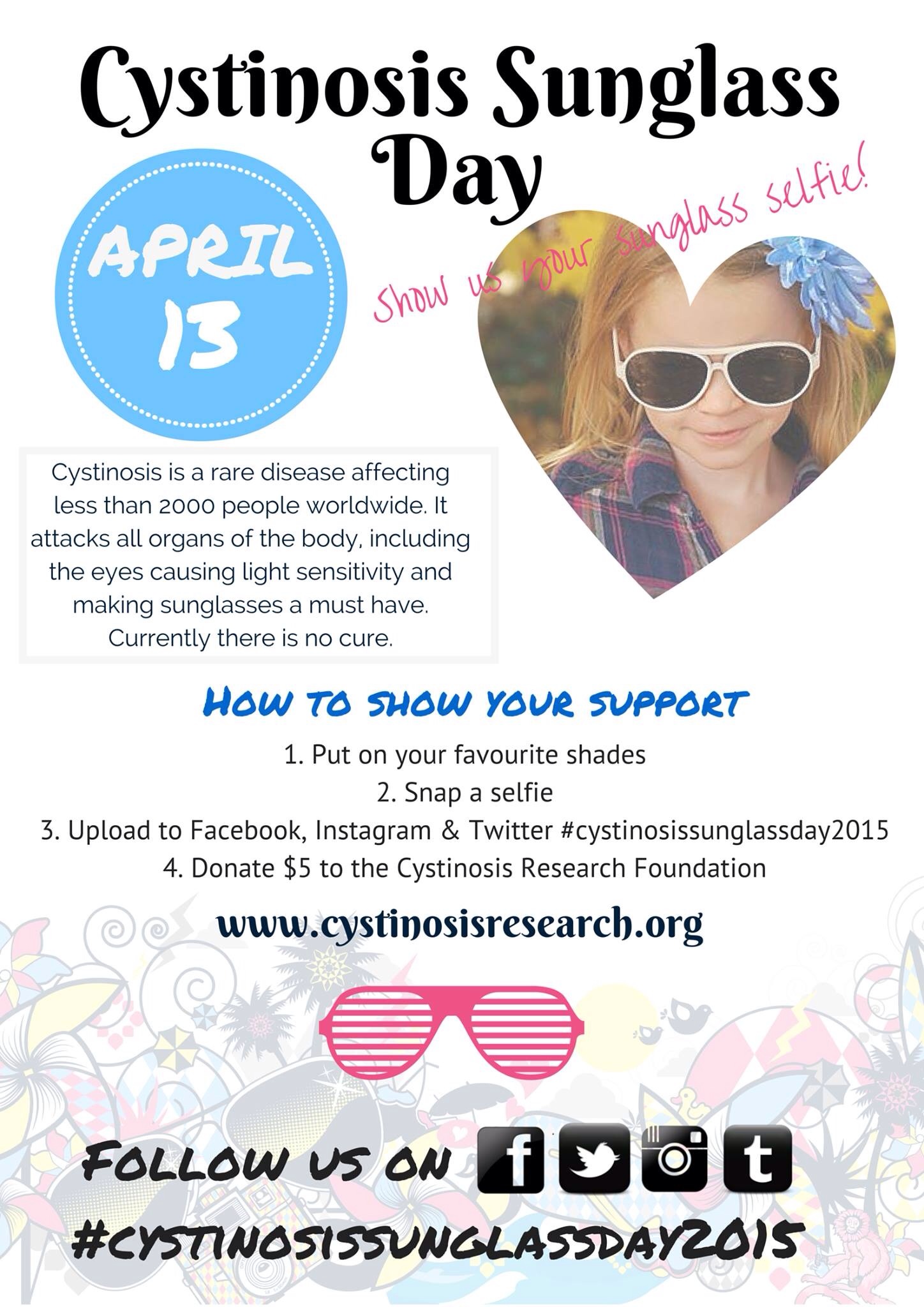 3. Upload to Twitter, Facebook and Instagram with the #cystinosissunglassday2015
