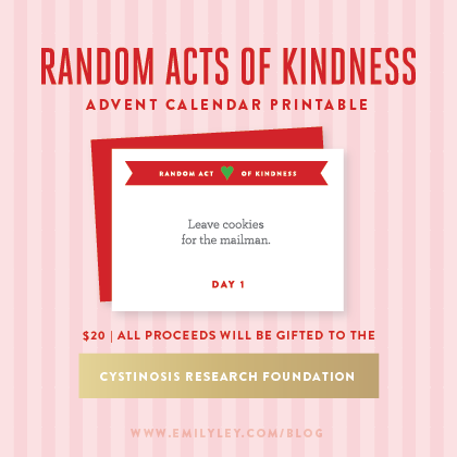 Head on over to Emily Ley to purchase this awesome Random Acts of Kindness printable advent calendar. You get 25 RAK activities that can be done each day leading up to Christmas as well as 25 cards to hand out to your lucky recipients. It’s a great way to get your yourself and your kids involved in your community and spread some holiday cheer! And the best part about this advent calendar is that all proceeds are donated to the Cystinosis Research Foundation where 100% of donations go to funding research towards Elsie’s (and everyone else with cystinosis) future.